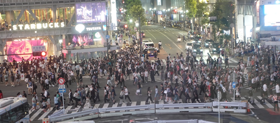 Shibuya Crossing in the early evening. This incredible display of organised chaos has something typically Japanese. Most of the traffic which passes while the people wait are taxis and buses, very few private cars. This could have been moved underground, as the traffic in all stations is coordinated, but instead they have allowed this extraordinary display of patient discipline to become a global icon, each crossing photographed by hundreds of tourists from the metro station overpass, or the opposite building windows. In that building, Starbucks oblige people to purchase their comestibles before gaining access to the few, awkwardly placed viewing windows.