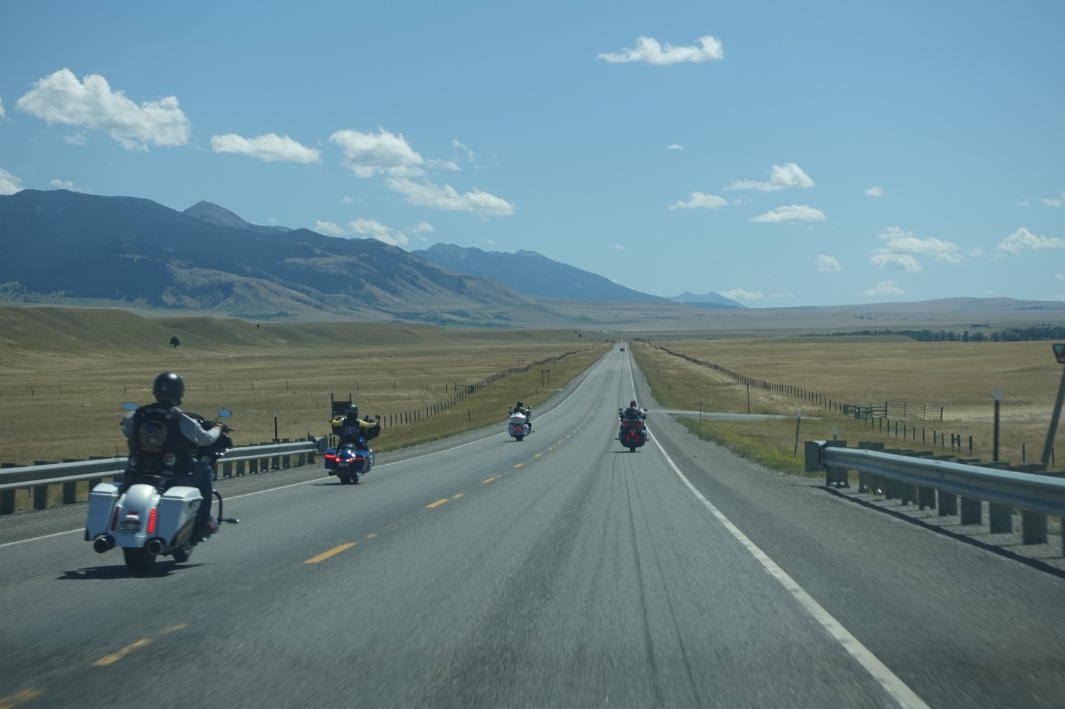 We go on to the the Lewis and Clark Caverns State Park Tourist Information Office, where we have a pleasant chat with a lady receptionist (in fact, all the tourist office staff have been very friendly and informative), buy two fun t-shirts, before heading on to pass south between two mountain ranges, the Gavelly and Madison. At Ennis we discover a wild west town with shops and buildings lining a single street, like in the movies. We stop at a rest stop later, where we overhear a group of Harley Davidson advanced age gents and a tattooed woman boasting about their vehicles. We witness a hawk hovering before diving on its prey.