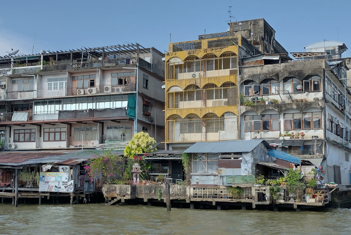 There is a variety of buildings which line the river front. Some modern developments, but often these sort of ramshackle houses on stilts.