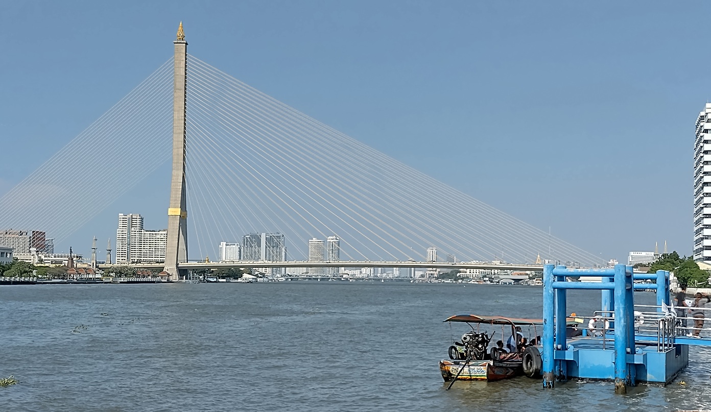 Bhumibol Bridge, also known as the Industrial Ring Road Bridge. The photo shows only one part of two, which make up the river transit parts of the 13 km long Industrial Ring Road connecting southern Bangkok with Samut Prakan province.