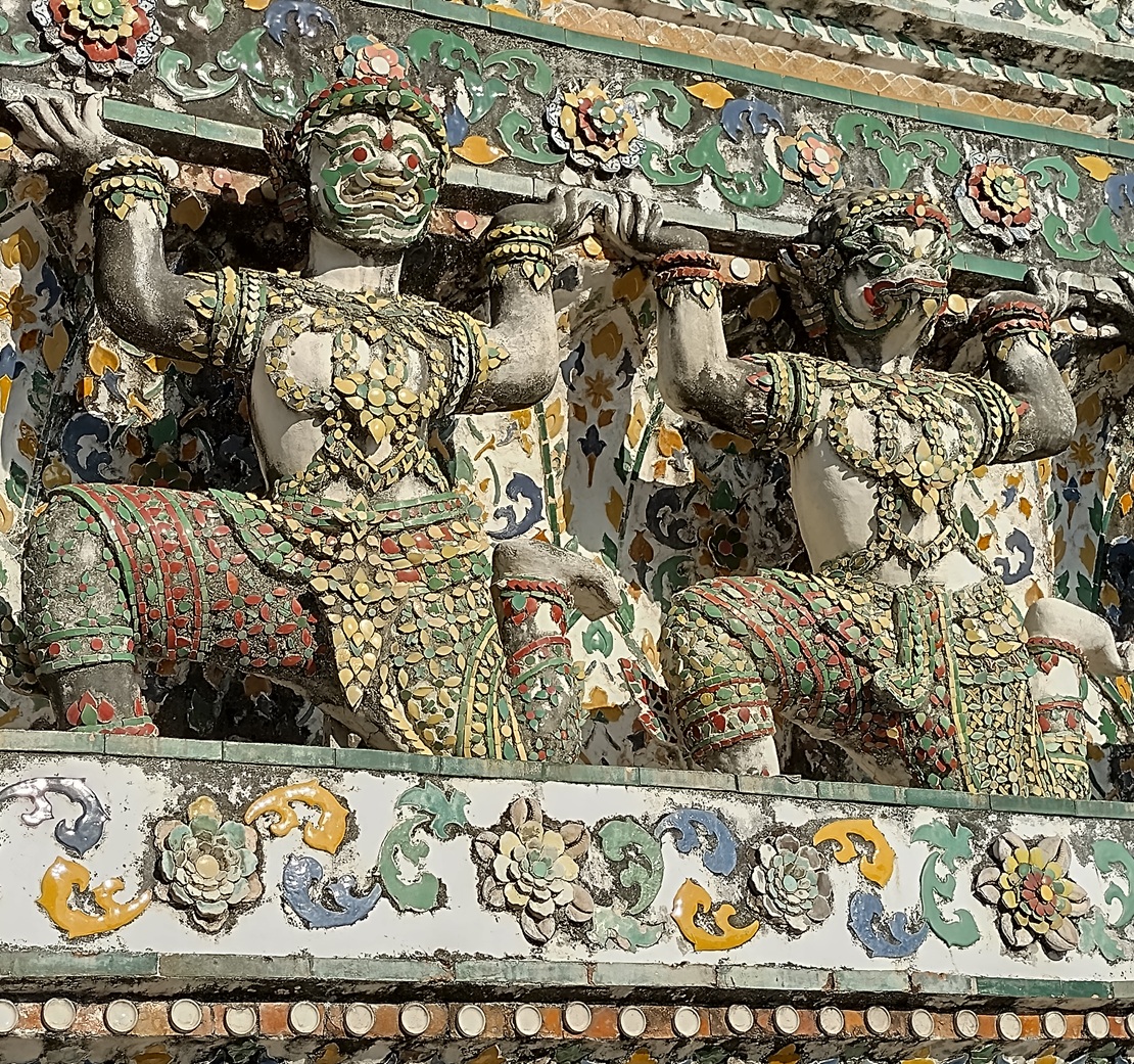 Close up of the Yaksha and monkey supporting figures on Wat Arun’s main prang.